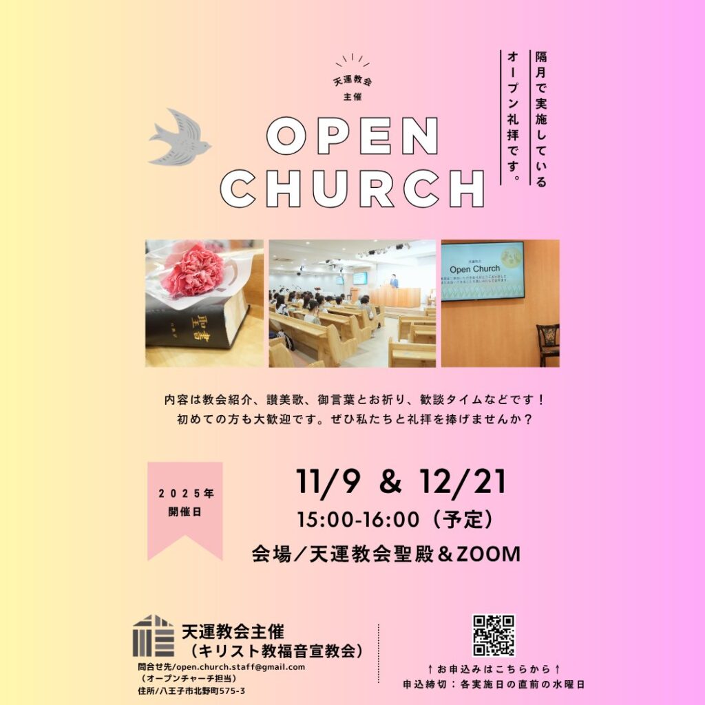 11月も天運教会では、どなたでもご参加いただけるオープン礼拝を行います!はじめての方も大歓迎です!参加申請は参加フォームよりお願いいたします。皆様のご参加お待ちしております!! ・日時11/16(日) 15:00-16:00・場所:天運教会聖殿&zoom・内容:... -
